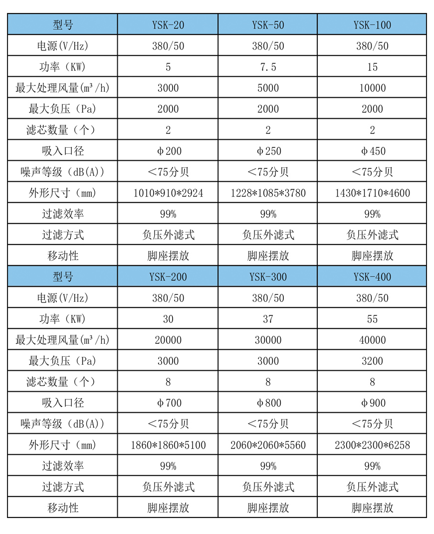 淀,設備配備自動化程序定時排放,處理后的干凈空氣經過YSLS水霧過濾器及YSLJ精密水霧過濾器兩次過濾,排放空氣相
