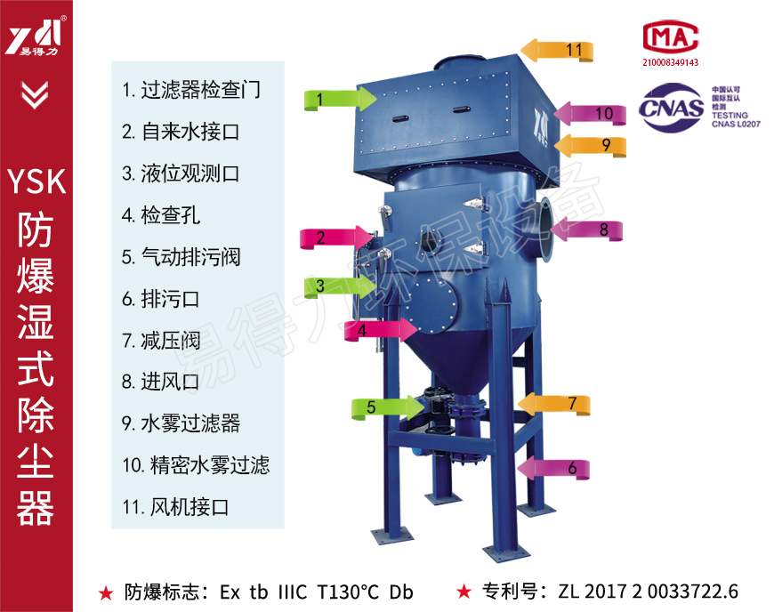 1.工作原理:YSK型防爆濕式除塵器采用Q235B鋼板制作,中心處理器采用304不銹鋼。防爆濕式除塵器是利用與洗滌液