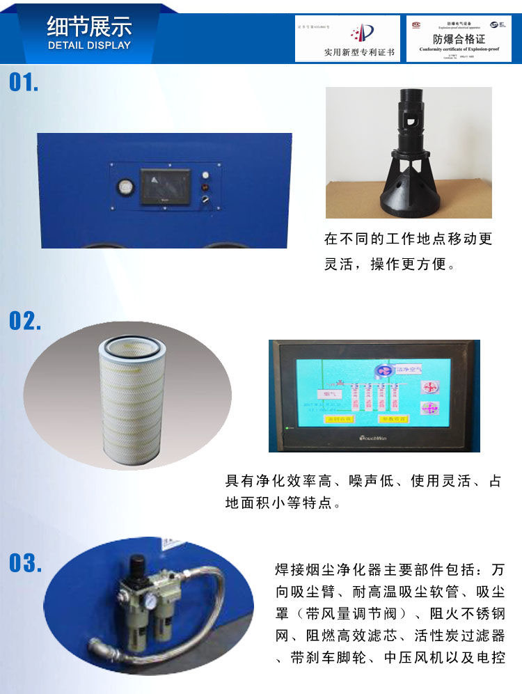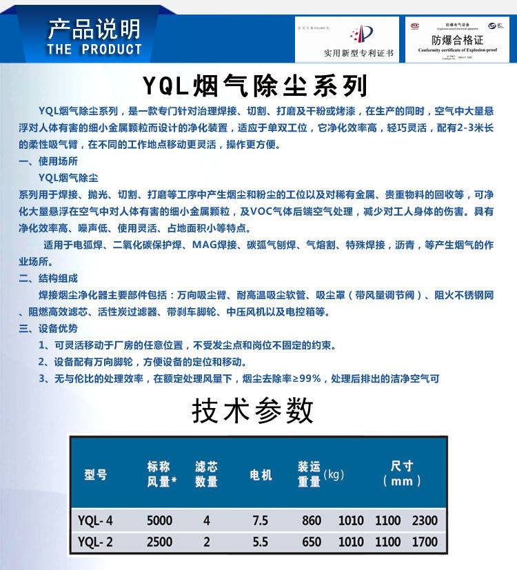 • YQL煙氣除塵系列,是一款專門針對治理焊接、切割、打磨及干粉或烤漆,在生產的同時,空氣中大量懸浮對人體有害的細小金屬顆粒而設計的凈化裝置,適應于單雙工位,它凈化效率高,輕巧靈活,配有2-3米長的柔性吸氣臂,在不同的工作地點移動更靈活,操作更方便。