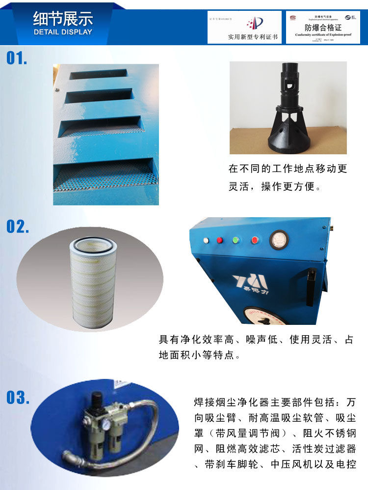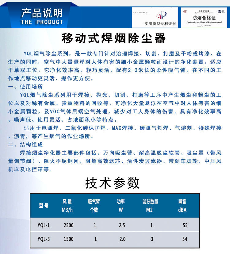 • YQL煙氣除塵系列,是一款專門針對治理焊接、切割、打磨及干粉或烤漆,在生產的同時,空氣中大量懸浮對人體有害的細小金屬顆粒而設計的凈化裝置,適應于單雙工位,它凈化效率高,輕巧靈活,配有2-3米長的柔性吸氣臂,在不同的工作地點移動更靈活,操作更方便。