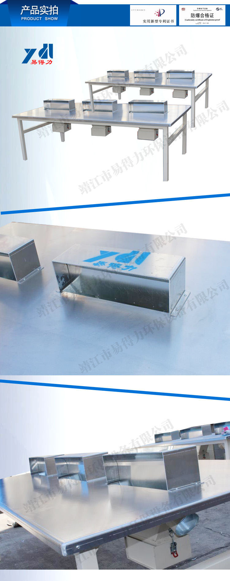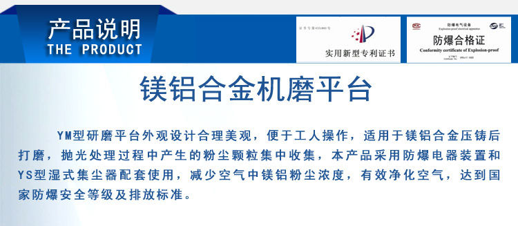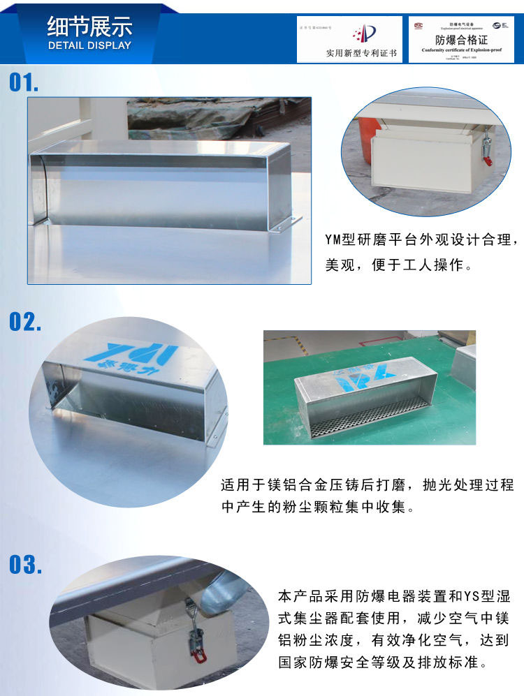 • YM型研磨平臺外觀設計合理美觀,便于工人操作,適用于鎂鋁合金壓鑄后打磨,拋光處理過程中產生的粉塵顆粒集中收集,本產品采用防爆電器裝置和YS型濕式集塵器配套使用,減少空氣中鎂鋁粉塵濃度,有效凈化空氣,達到國家防爆安全等級及排放標準。