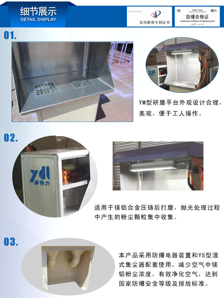• YM型研磨平臺外觀設計合理美觀,便于工人操作,適用于鎂鋁合金壓鑄后打磨,拋光處理過程中產生的粉塵顆粒集中收集,本產品采用防爆電器裝置和YS型濕式集塵器配套使用,減少空氣中鎂鋁粉塵濃度,有效凈化空氣,達到國家防爆安全等級及排放標準。